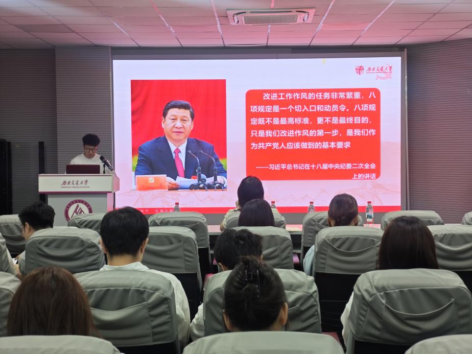 会议第三项,重温中央八项规定精神,专题加强作风建设。邰浩云通过剖析“舌尖上的腐败”等典型案例,以“哪些饭不能吃”、“哪些饭可以吃”为切入点,生动阐述了严守纪律规矩的重要性,并围绕“饭局前三问三想”(问谁买单、和谁吃、在哪吃;想是否符合规定、是否有求于你、是否有不良后果)进行了热烈讨论,一致表示研究生党员要时刻保持警醒,筑牢思想防线,做一名清清白白、遵规守纪的合格党员。