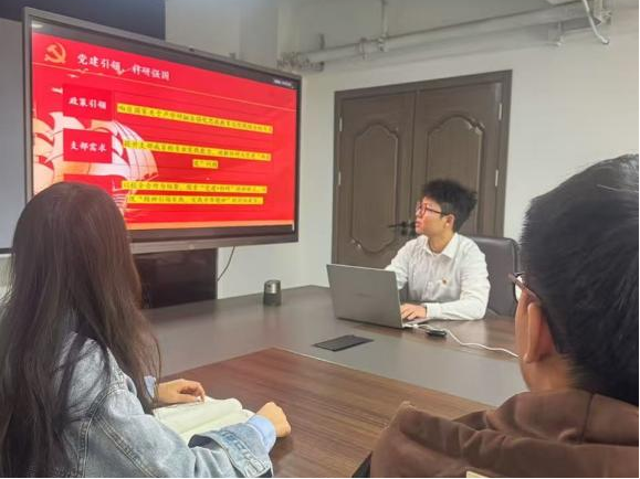 专题学习·精神铸魂:党员们围坐研讨历史文献,结合材料学科发展史,深入理解科技自强在民族救亡与复兴中的关键作用。图片捕捉了同志们凝神聆听、热烈讨论的瞬间,展现了思想碰撞的火花。