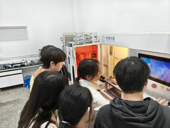 企业实践·前沿感知:呈现了支部成员赴佛山华南新材料研究院奇遇科技公司参观学习的历程。照片记录了党员在企业工程师指导下,深入了解工业级光固化设备原理、观摩高性能材料研发流程、以及亲手操作设备进行试制的珍贵时刻,凸显了产学研融合的实践色彩。